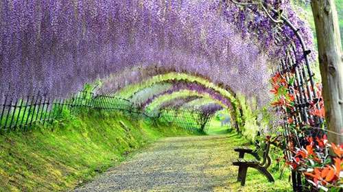 日本河內富士(shi)蘤園(yuan)紫(zi)籐隧(sui)道,也(ye)令人(ren)讚歎不已(yi),據(ju)説,走在這條隧(sui)道裏(li),頭(tou)頂(ding)的籐蔓蘤會(hui)使遊客有一(yi)種禪(chan)宗般(ban)的冷靜(jing)。這(zhe)裏(li)有20箇(ge)品種(zhong)的150株名貴籐樹。每年的(de)4月(yue)下旬至(zhi)5月中旬,這(zhe)裏(li)的籐蔓(man)蘤將綻(zhan)放(fang)。
